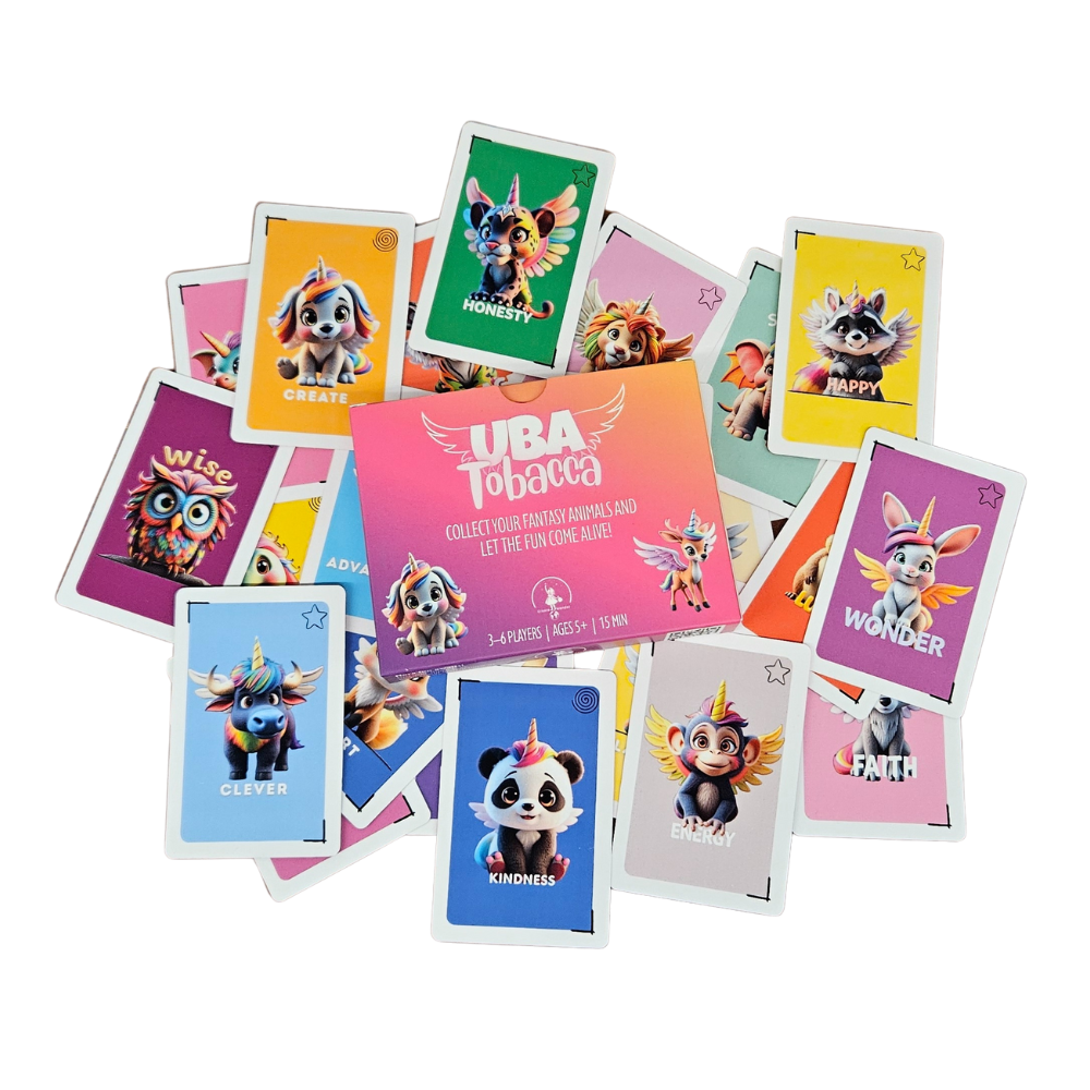 Collect pairs of fantasy animals, call out "UBA Tobacca!", and enjoy rounds of laughter, strategy, and connection until you have played all cards. With 25 uniquely designed fantasy animals an 3 special magic cards, UBA Tobacca is simple to learn, yoyful to play, and filled with magic.